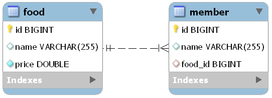- One에 해당하는 Entity(Food Entity)가 외래 키를 관리하며, 외래 키의 주인입니다.