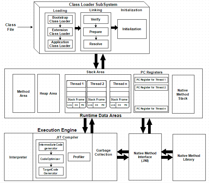 - JVM 내부에 바이트 코드(.class)를 로드하고 링크를 통해 배치하는 작업을 수행한다.