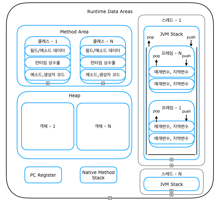 - Frame 내부에는 로컬 변수 Stack이 있으며, 변수가 초기화될 때 이 영역에 생성된다. 변수는 선언된 블록 안에서만 로컬 변수 Stack에 존재하고, 블록을 벗어나면 제거된다.