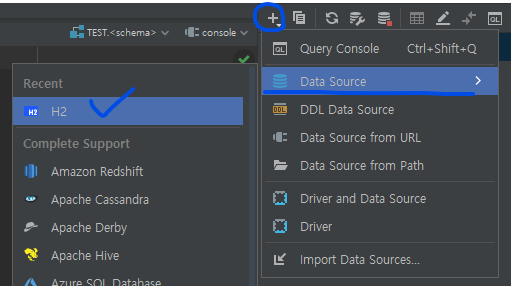 다음과 같이 H2 데이터 베이스를 IntelliJ에서 스프링 프로젝트에 연동하려고 한다.