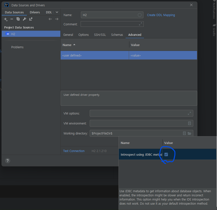 DB 생성 창에서 기본 설정을 입력하고 Advanced -> Expert Options -> Introspect using JDBC method 의 체크박스에 체크를 해주었다.