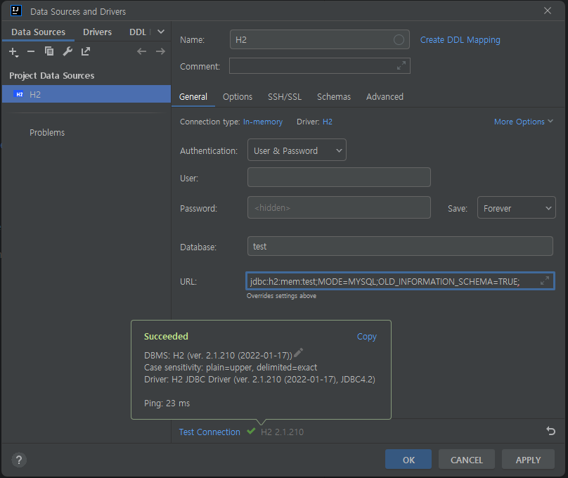 - URL : jdbc:h2:mem:test;MODE=MYSQL;OLD_INFORMATION_SCHEMA=TRUE;